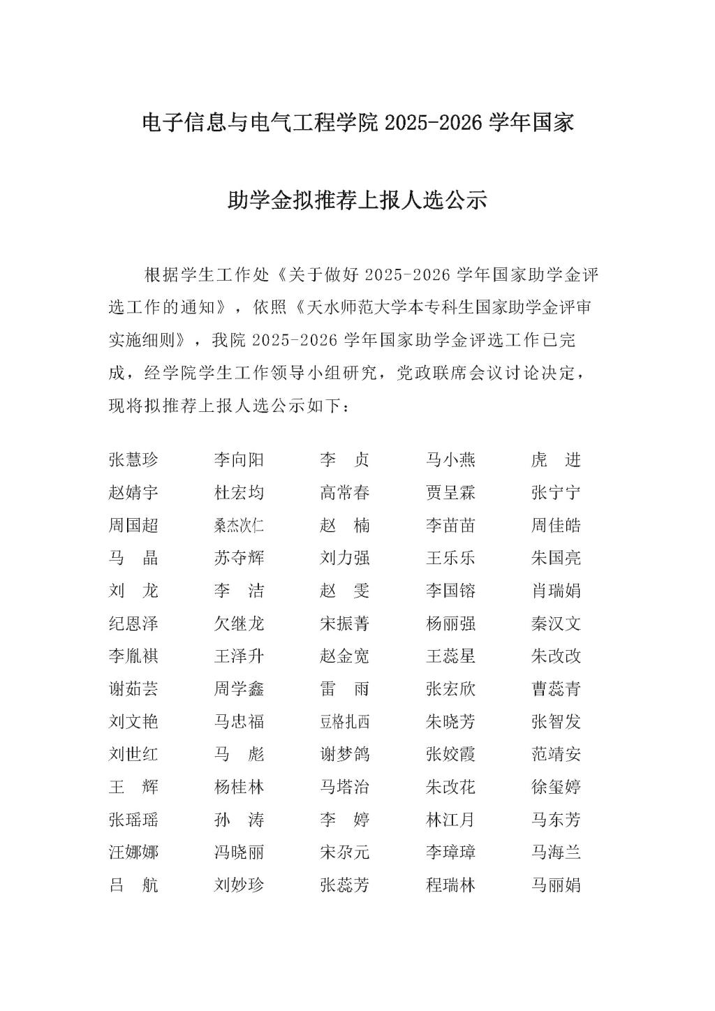 2025-2026学年国家助学金拟推荐上报人选公示